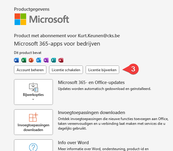 Vervolgens klik je op "Licentie bijwerken". Hierna log je terug in met je CKS Microsoft account en gaan alle licenties terug ingeladen worden